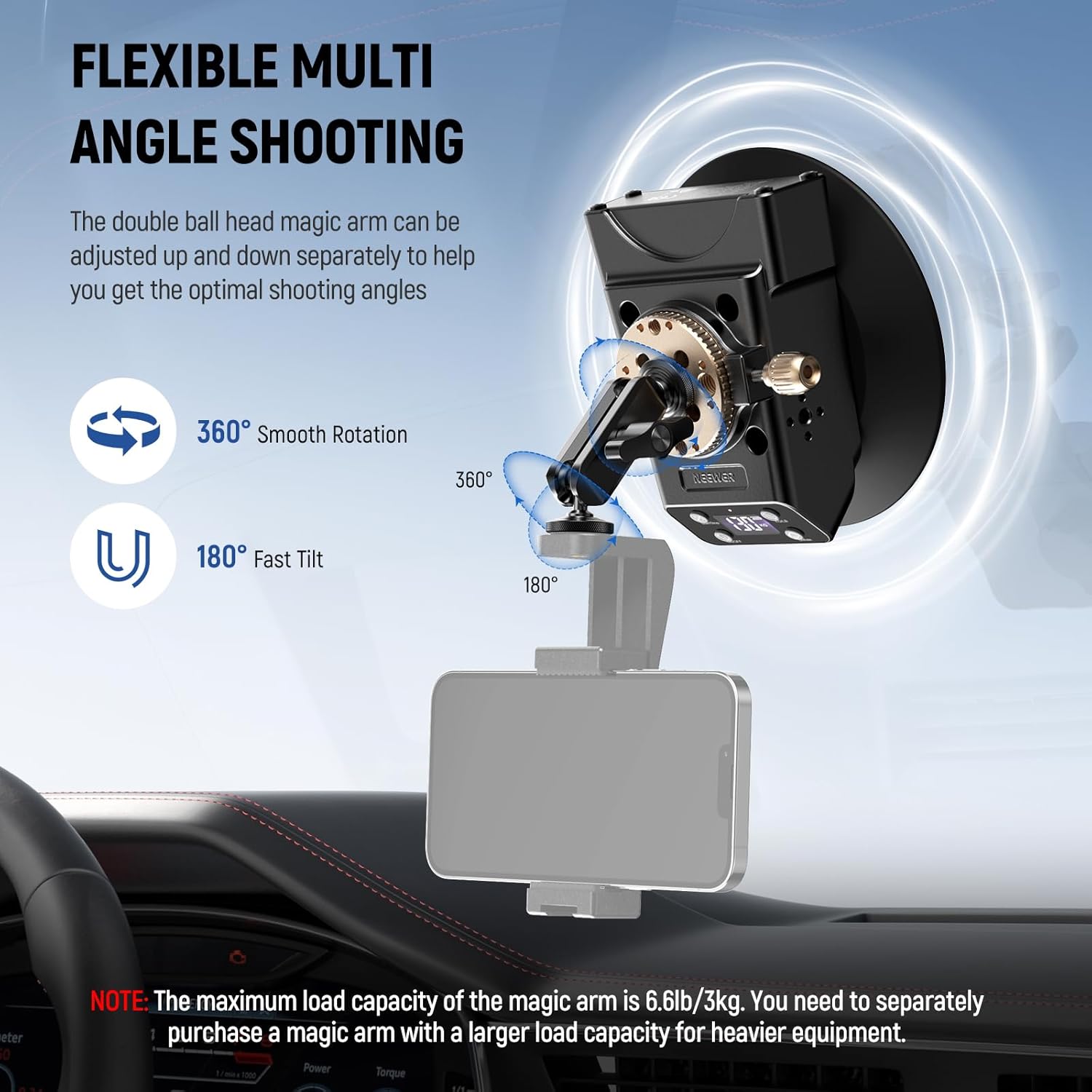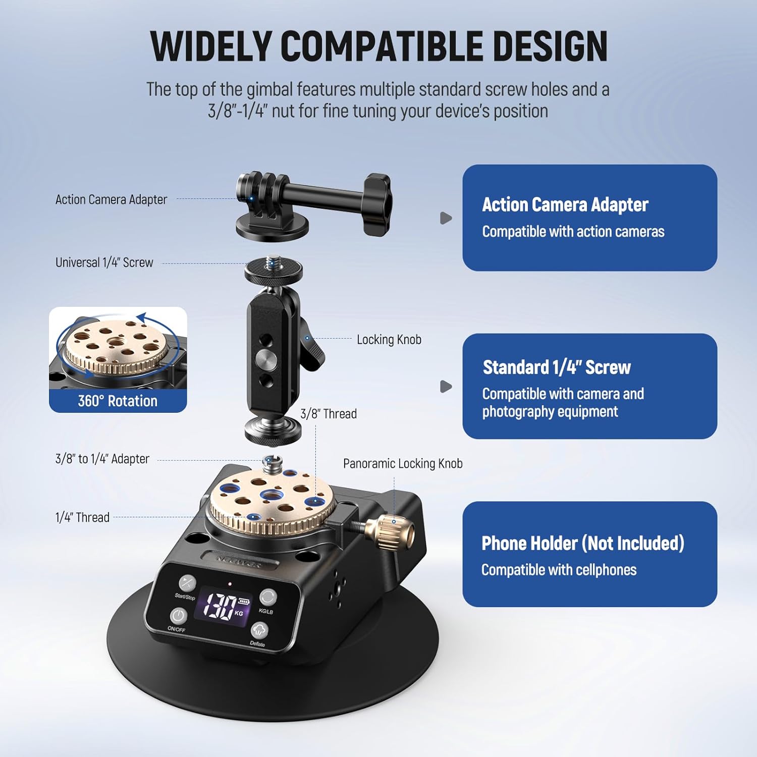 【One Click to Start/Deflate】 NEEWER CA017 innovates with electric mounting instead of manual mounting. One click to start the vacuum pumping, fast and accurate. Equipped with a digital display and supports intelligent monitoring of the internal air pressure of the suction cup. One click the “Deflate” button to release the inside air. The indicator light flashes for low battery. note: Please remove the device before deflating to avoid damage by dropping, and keep an eye on the battery level