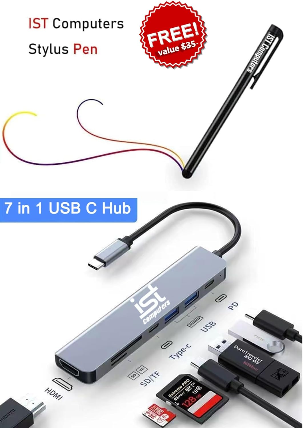 USB-C 3.2(data only), USB-A 3.2, USB-A 2.0, HDMI 1.4 port, Headphone / microphone combo jack, SD Card Reader; Enjoy enhanced connectivity with the bundled IST Computers 7-in-1 Hub, featuring HDMI (4K@30Hz), USB-C 2.0, two USB 2.0 ports, Type-C Power Delivery, and an SD/TF card reader; Wi-Fi 5 + Bluetooth; HD Webcam