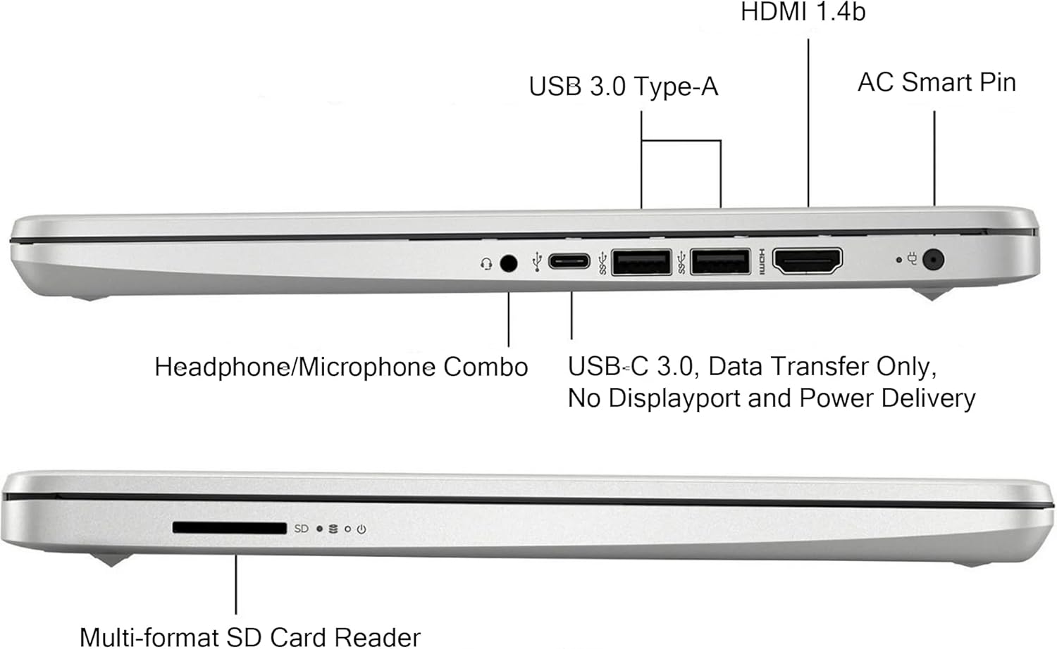 【Ports and Connectivity】1 SuperSpeed USB Type-C (Data Transfer Only, No Displayport and Power Delivery), 2 SuperSpeed USB Type-A 5Gbps signaling rate, 1 x Headphone / Mic Combo Jack, 1x HDMI, SD Card Reader, HP Wide Vision 720p HD camera with Camera Shutter. Wi-Fi 5 and Bluetooth combo, Non-backlit Keyboard.