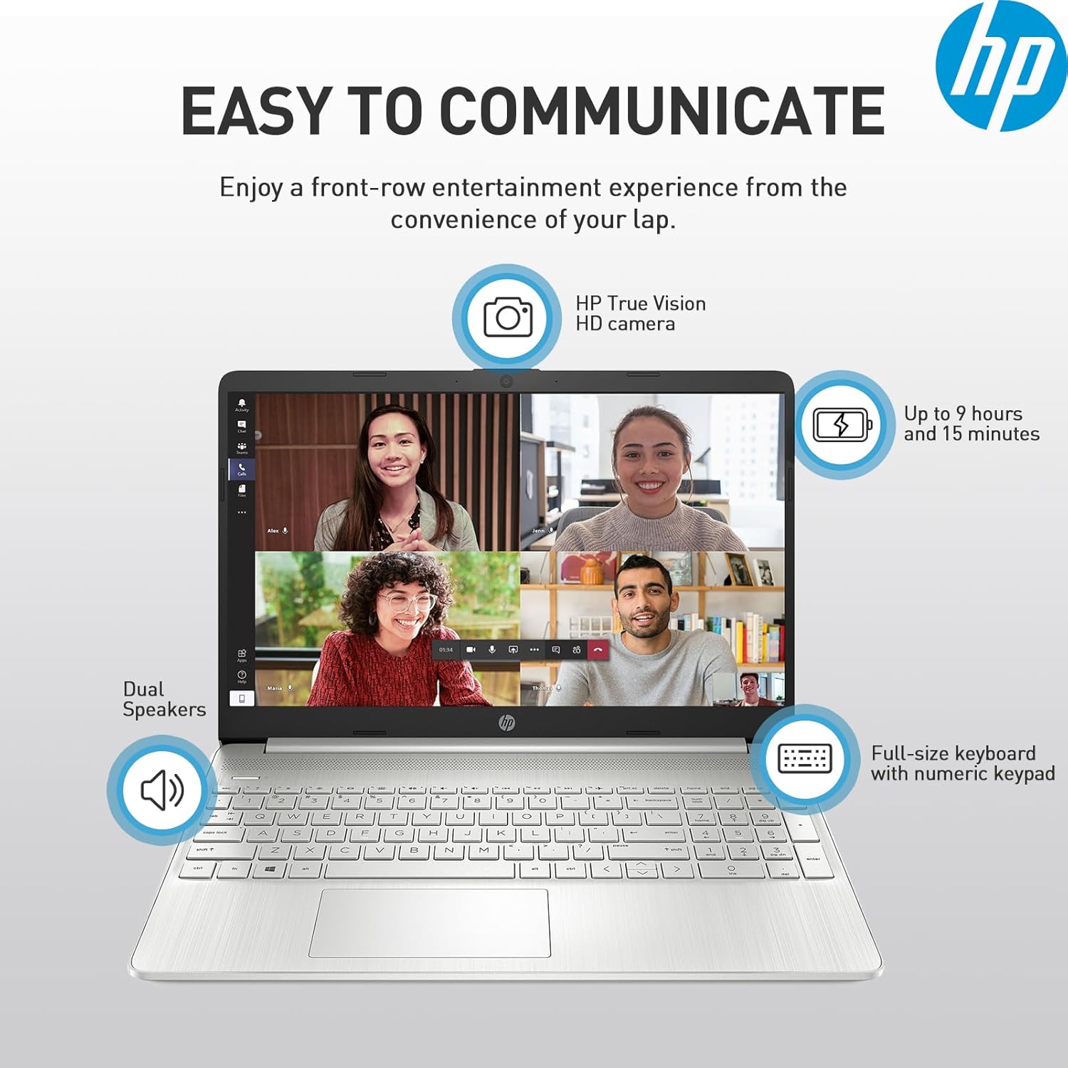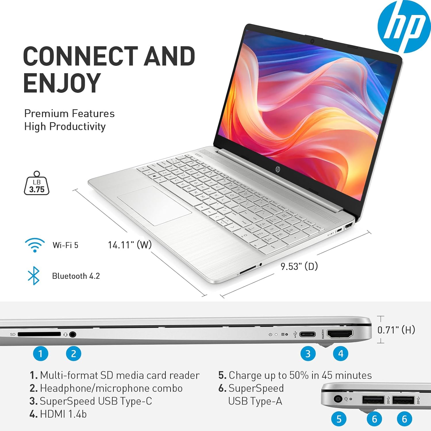 Up to 9.25 hrs runtime+HP Fast Charge (50% charge in 45 mins) – lets you work or play all day long