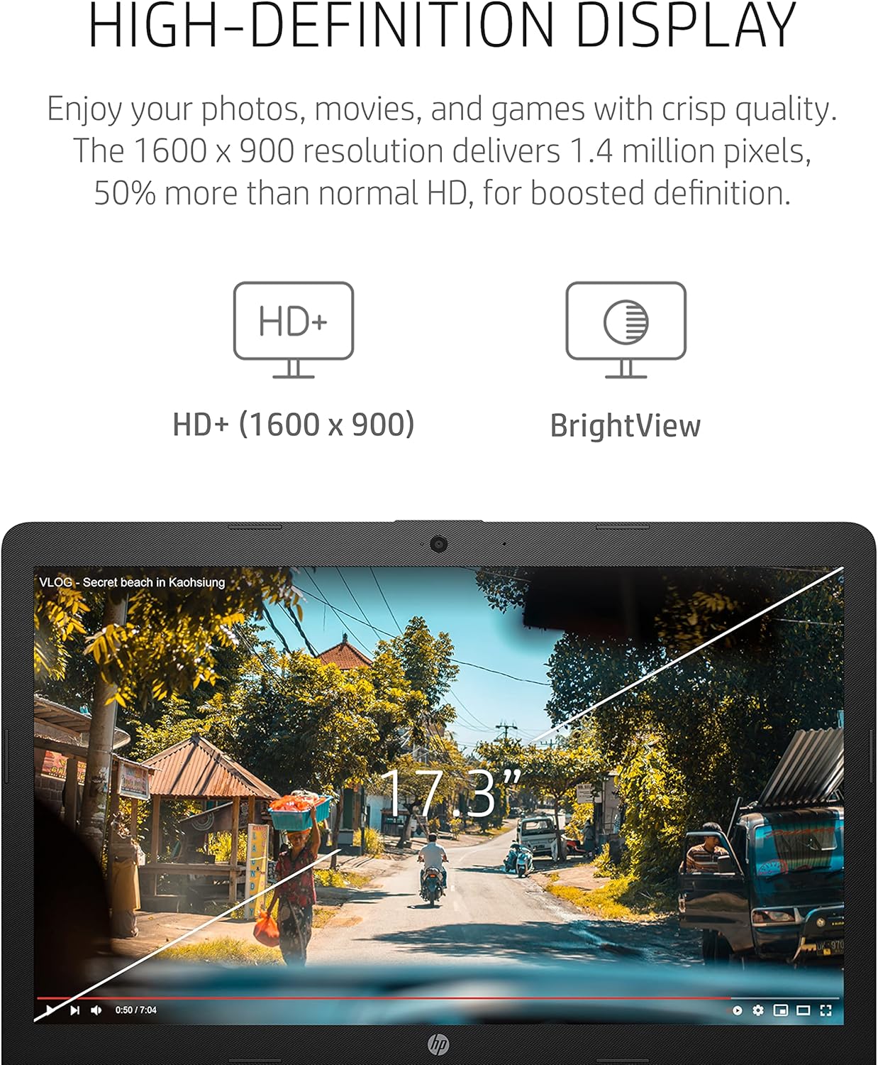 HD PLUS DISPLAY – View all your photos, movies, and games in crisp HD Plus (1600 x 900) resolution on a narrow-edge, 17.3-inch diagonal display (1). Plus, the BrightView glossy finish means on-screen colors pop while blacks appear deep and distinct.