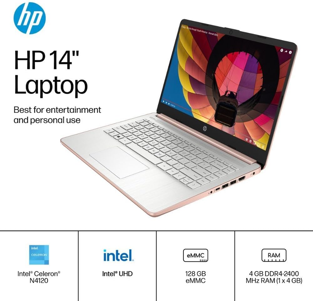 HP 2024 Stream 14″ HD Thin and Light Laptop, Intel Celeron N4120, 16GB RAM, 128GB eMMC Storage, Long Battery Life, HD Webcam, HDMI, Rose Gold, Office 365 1-Year, Windows 11 S, 128GB Cuertns MicroSD