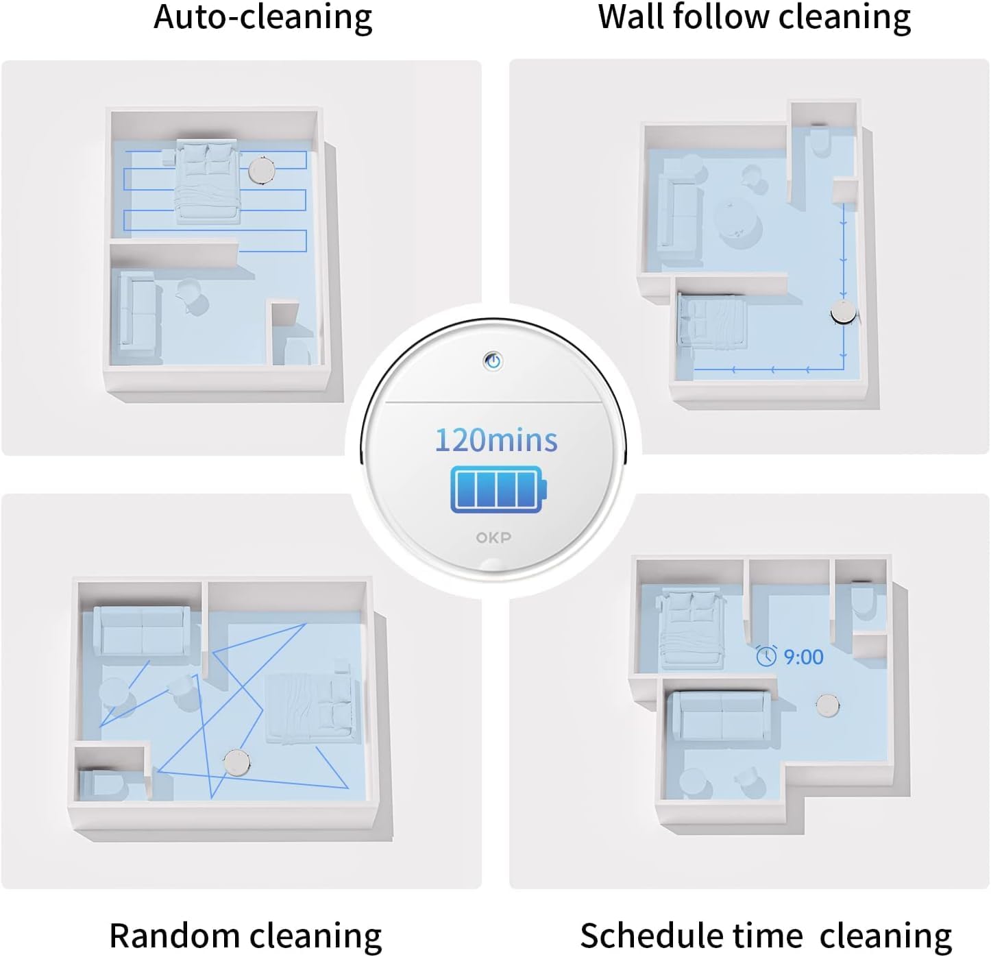 CLEAN SMARTER – OKP Life Robotic vacuum cleaner offers multi cleaning modes: automatic, random, edge, and spot cleaning.