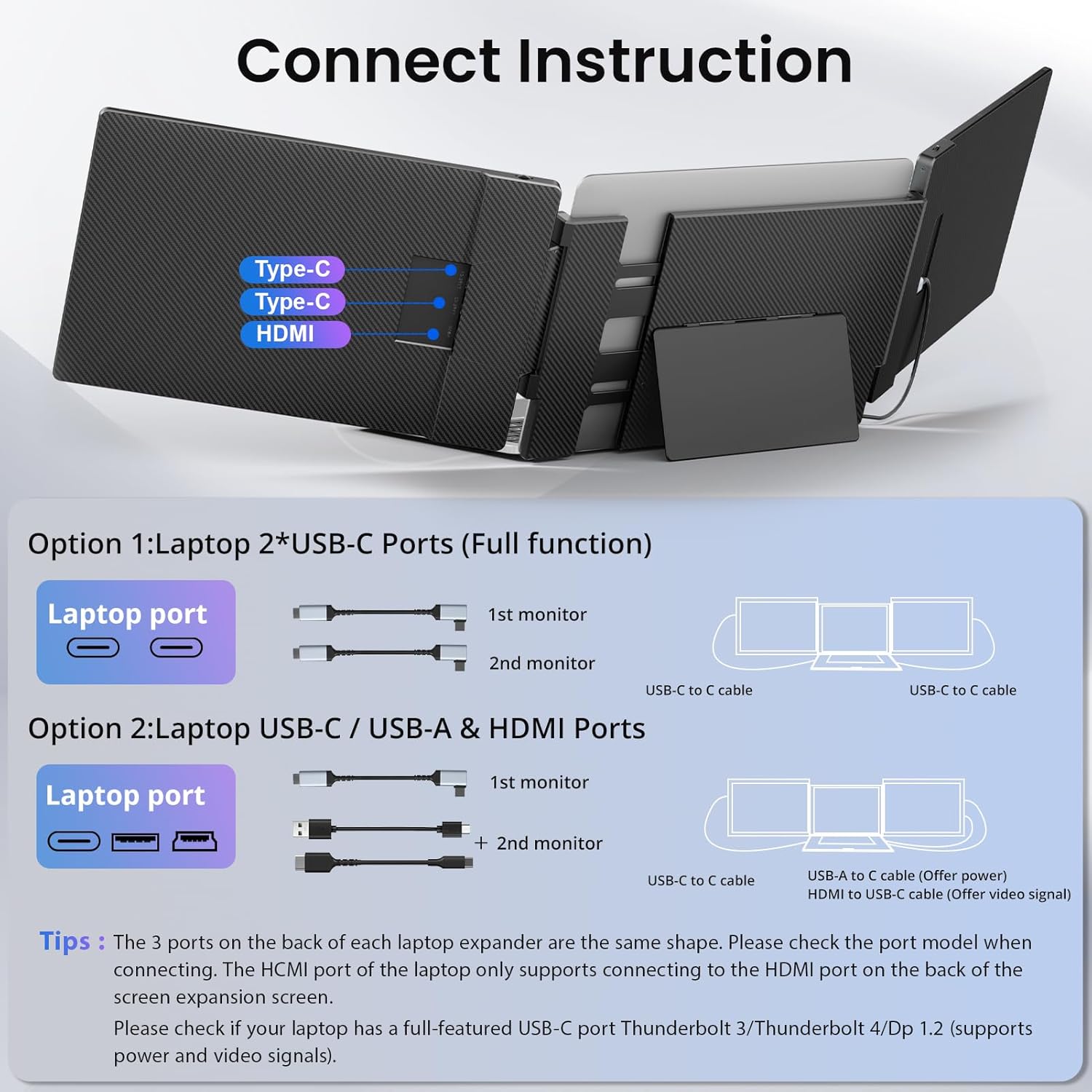 【Plug and Play, Easy to Use】The dual monitor attachment for laptops is plug and play, no driver required; It requires your laptop to have 2 fully functional USB-C ports, please use USB-C to Type-C to connect 2 screen extenders, or with 1 fully functional USB-C port and 1 HDMI port, please use USB-C to Type-C to connect one screen, and use HDMI and another USB-A to Type-C cable to connect another screen to provide signal output and power for dual-screen displays; Tip: Some laptops’ USB-C ports are not fully functional (only support power or video signals), please check before use; If you have any questions, please get in touch with our after-sales team and we will respond within 24 hours