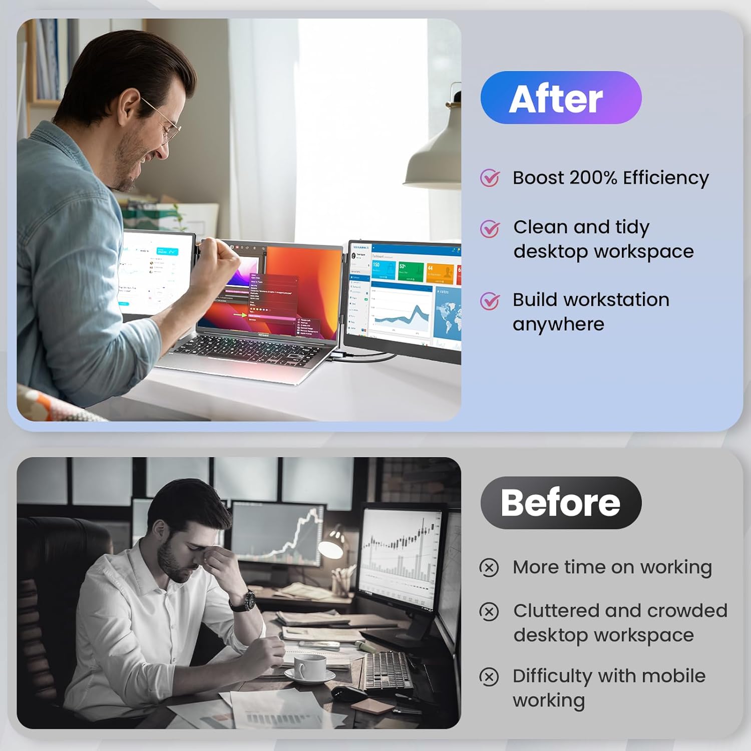 【Wide Compatibility】The laptop screen extender is compatible with a variety of devices and systems, including MAC, Windows, Android, Chrome & Switch; Ideal for home offices, remote workers, travelers, online meetings, IT workers, stock traders, gamers, etc; Tips: The screen extender is not compatible with Macbook Air with M1/M2/M3 chips; If you are not sure whether your laptop is compatible or have any usage problems, you can get in touch with us to provide you with a solution and we will reply within 24 hours