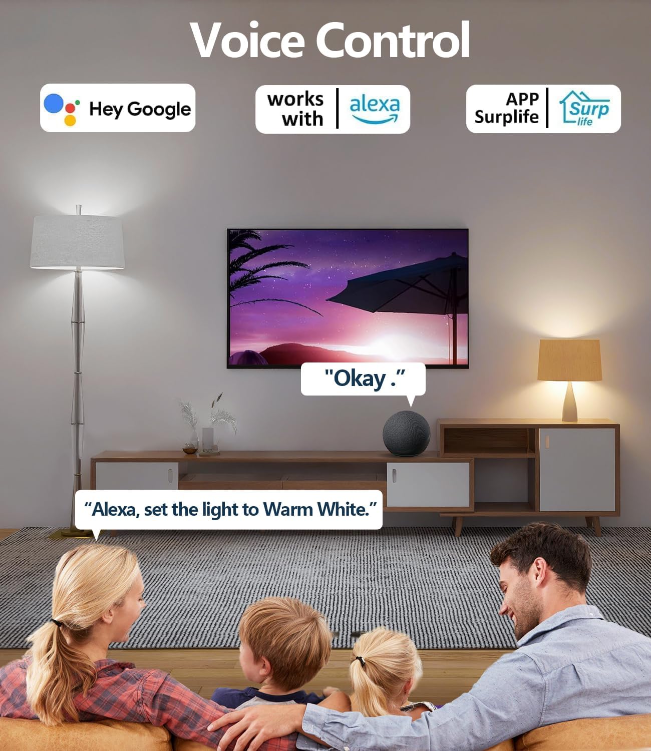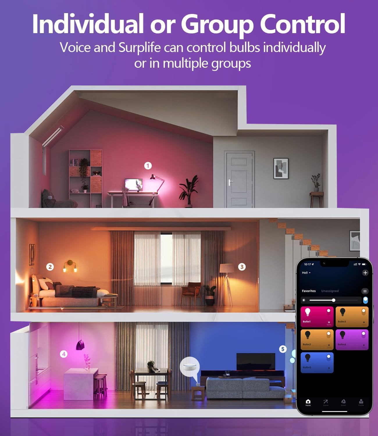 Voice and Group Control: Luckystyle smart light bulbs are compatible with Google Home/Alexa or Surplife APP. Control your smart lights via voice command or your phone to turn on/off or dim/brighten your smart LED light effortlessly. (e.g. ‘Hey Siri, set the bedroom light to green’). Just need to set scheme and and add them in, Up to 6 to 8 light bulbs can be controlled at a time. then they can be controlled together.