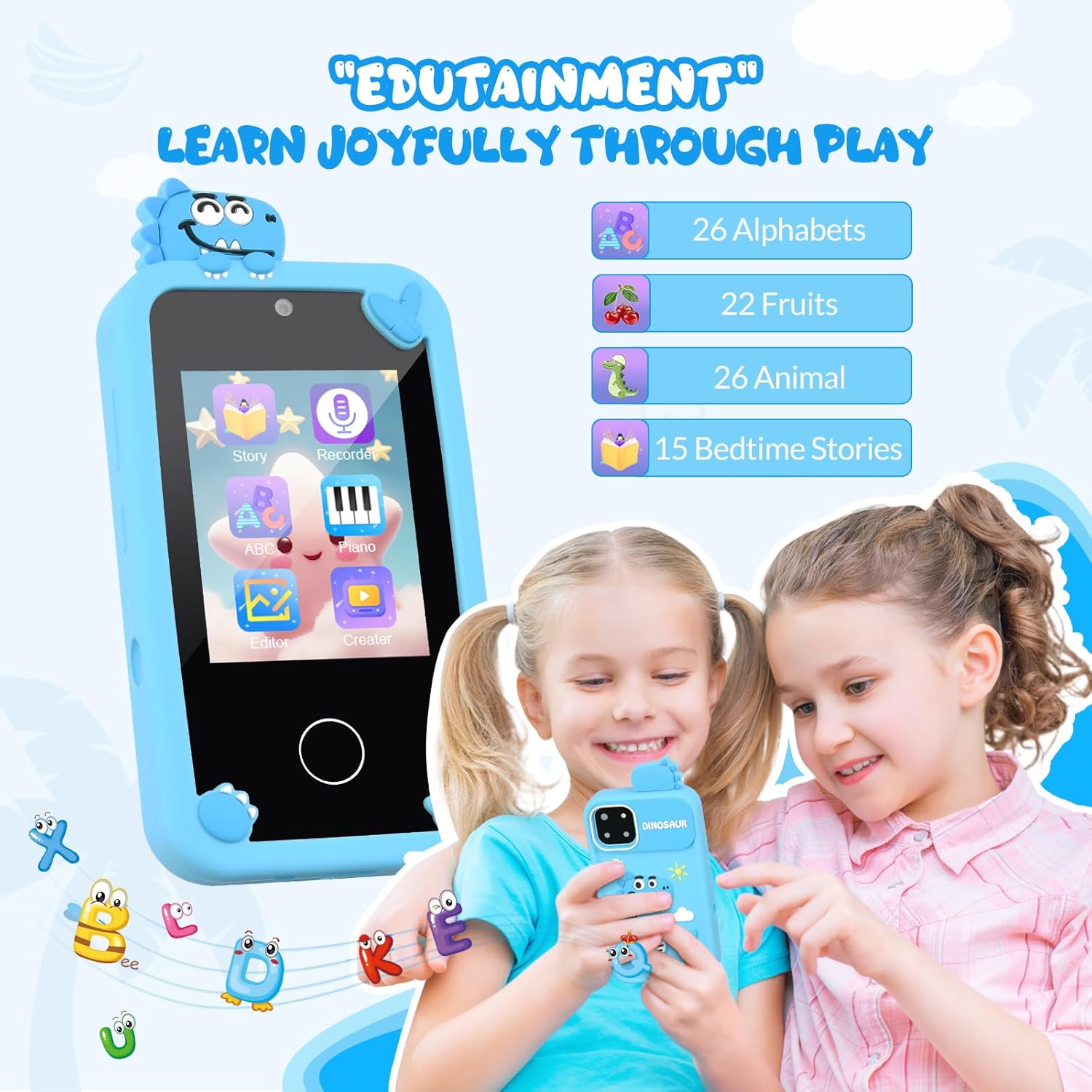 Mafiti Kids Smart Phone Toy for Girls,Kids Phone with 2.8″ Touchscreen,Toddler Learning Play Toy Phone with Dual Lens,1000mAh Battery,Birthday Xmas Gift for 3-10 Year Old Boys,Dinosaur Phone,Blue