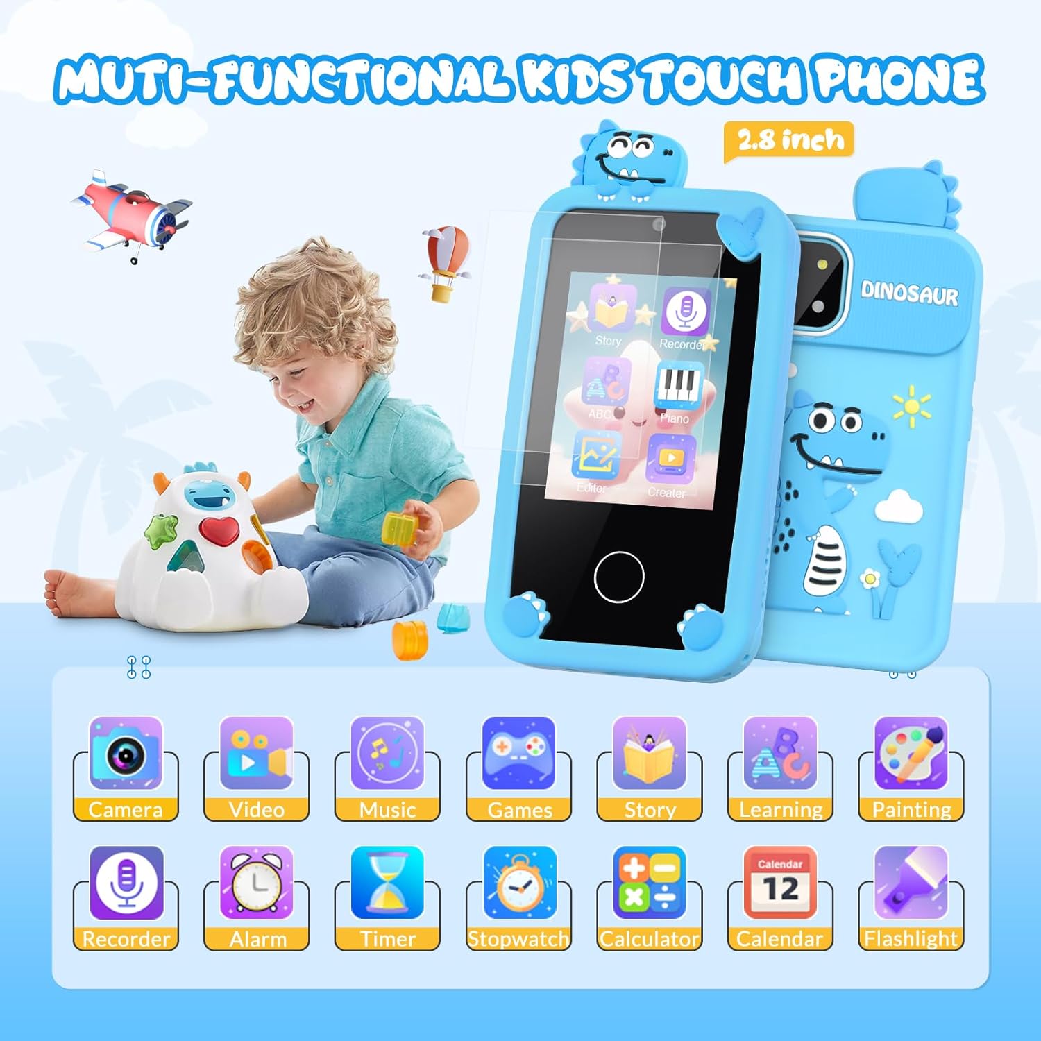 [Fun and Educational Kids Phone Toy] With a 2.8 inch screen, this kids smart phone offers hours of fun and learning for your child. They can learn the alphabet, fruits, and animals while playing games that enhance their cognitive skills. The piano and drawing functions encourage creativity, while listening to English and reading stories helps improve language skills. Plus, it comes with practical tools like a calendar, timer, alarm clock, calculator, and flashlight. Give your child the gift of education and entertainment with this amazing toy.