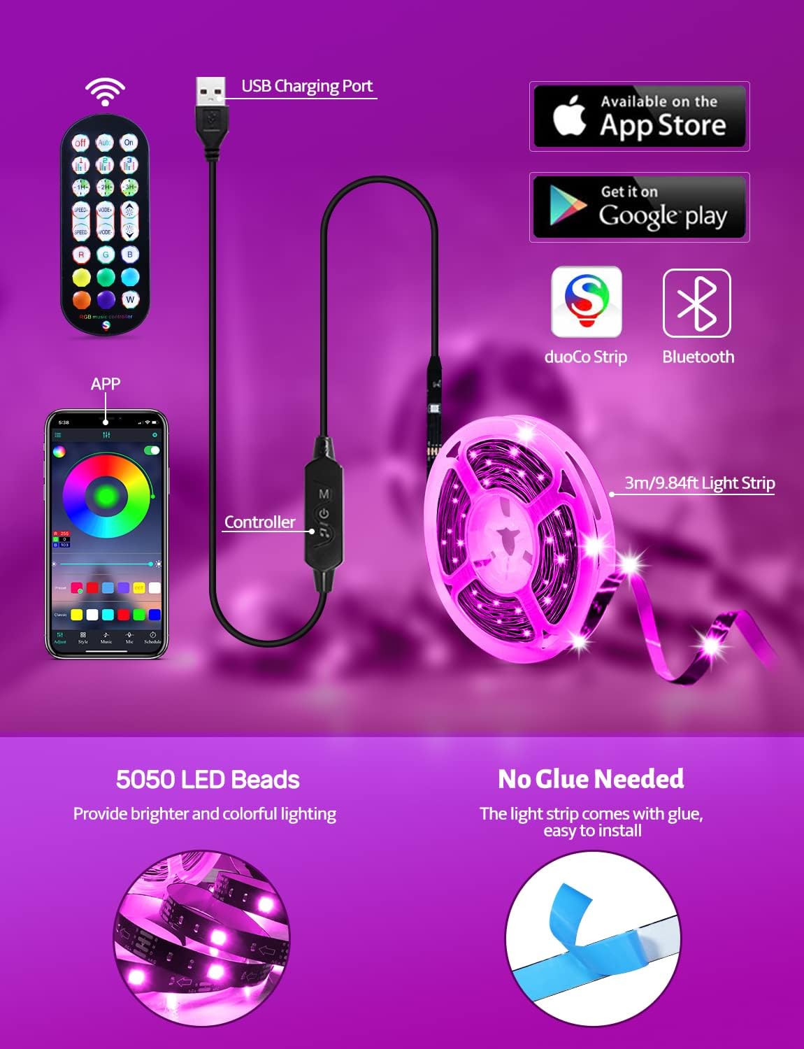 [ SMART APP BLUETOOTH TV LED LIGHTS ] – Use a smart, simple way to control your tv led lights. Download the free APP “duoCo Strip” in the Apple Store or Google play, then connect the tv led lights to usb power and turn on Bluetooth. The immersion tv led lights will automatically connect and display in the device list on the far left of the APP. Offers over 16 million colors and 21+ dynamic modes, music mode, timing mode, mic mode.