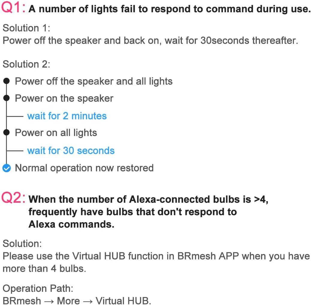 【Virtual HUB 】Please use the Virtual HUB function in BRmesh APP when you have more than 4 bulbs, which will effectively solve the problem of multi-light control. It also solves the problem of slow response or even non-response to Alexa voice commands due to the number of Alexa-connected devices. Operation Path: BRmesh → More → Virtual HUB.