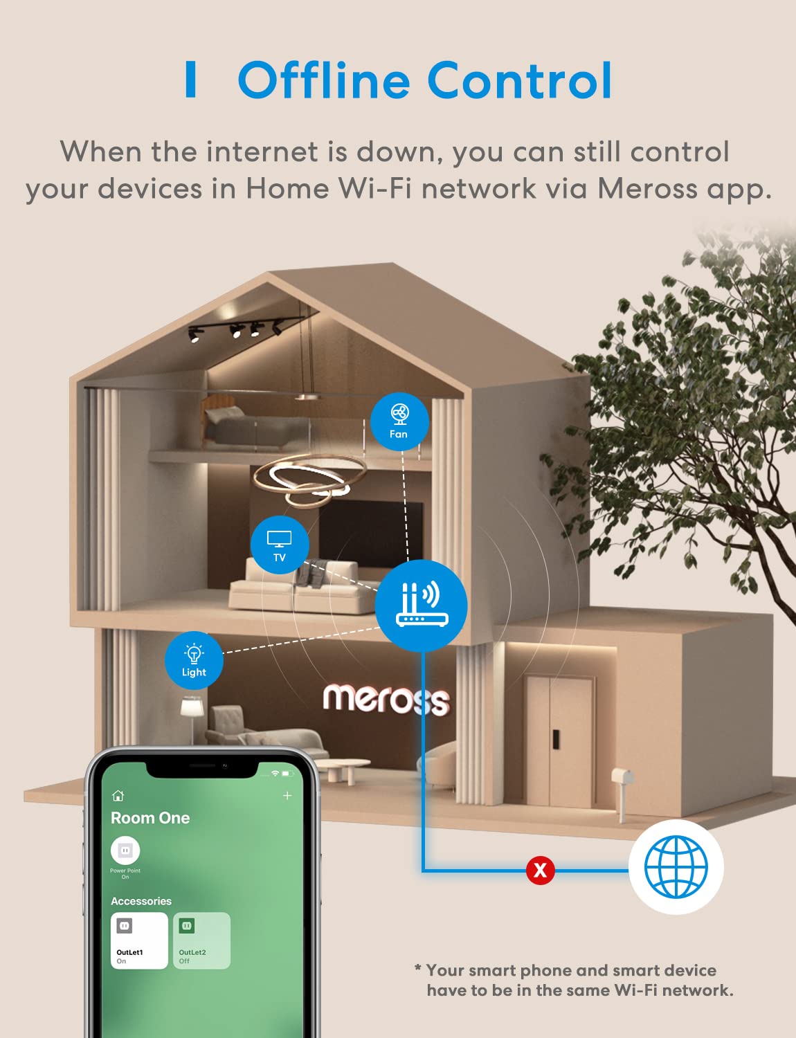 【Compact 2-in-1 Design】Meross 2 in 1 smart plug compatible with Apple HomeKit, Google Home, Amazon Alexa, and SmartThings, easy to get 2 spaced outlets. Mini enough with a wide place between the two sockets, no interference, and more space-saving. It supports max total output of 15A.