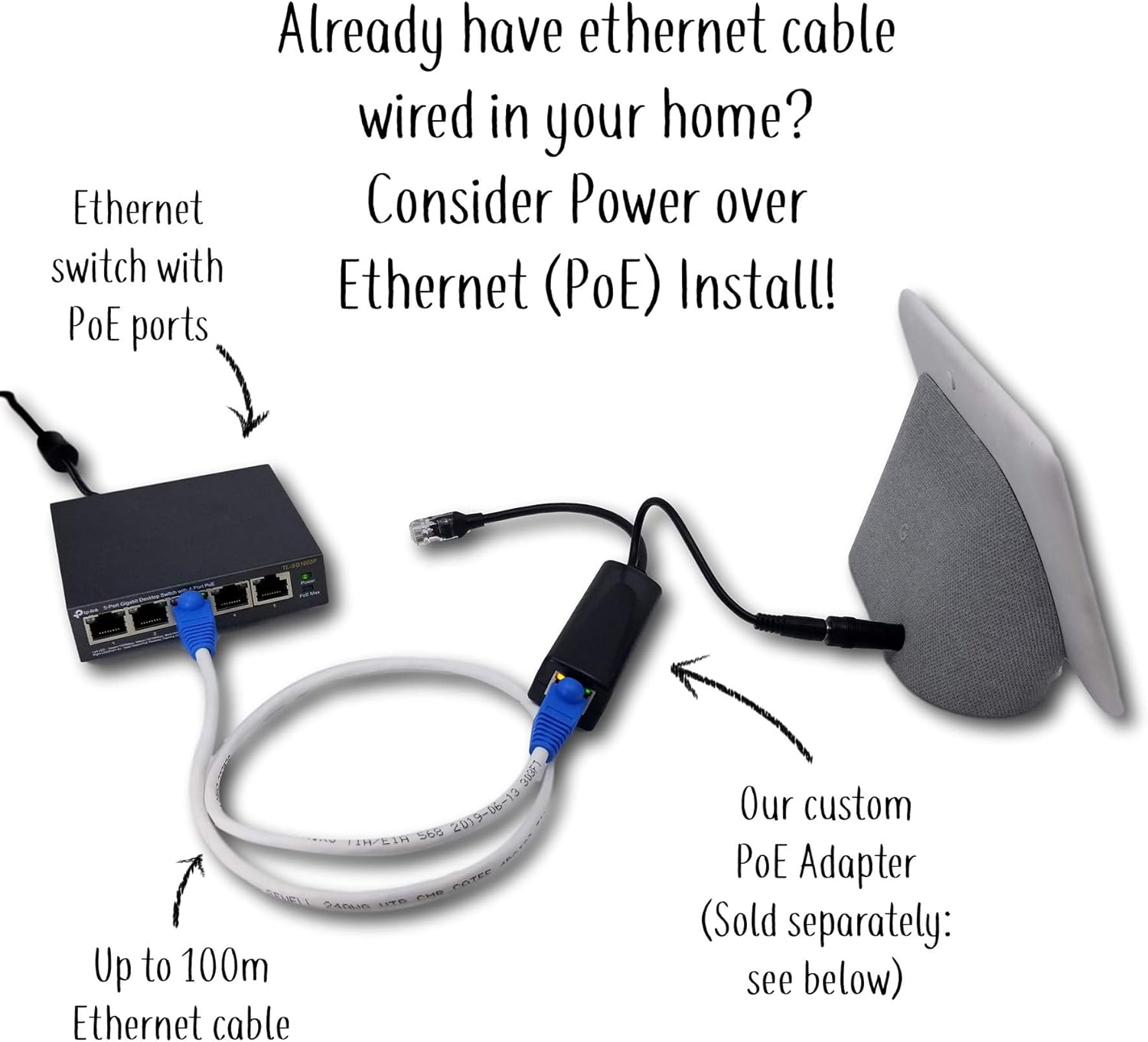 Works great with Power over Ethernet for simple wiring solutions. See below for our custom PoE adapter.