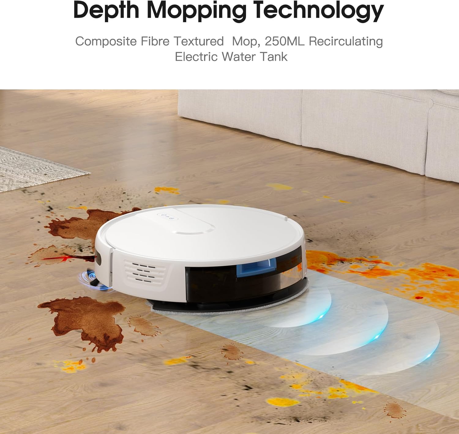 【Long-Lasting Cleaning with a Larger Dustbin&Water Tank】The robot can be powered by a super-sized battery power for extend cleaning with Combined Dustbin & Water Tank, supporting a maximum vacuuming range of 3229 sqft. In addition, it takes care of every corner day and night, so you do not have to.